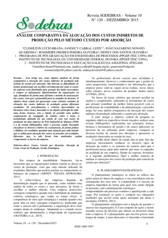 Palavras-chave: Custos. Custeio por Absorção. Alocação de Custo. Custo de Produção. Gestão Estratégica.