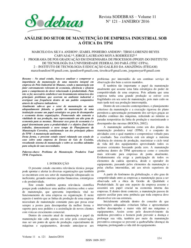 Palavras-chave: Problema de Manutenção. Produtiva Total TPM. Frequência.