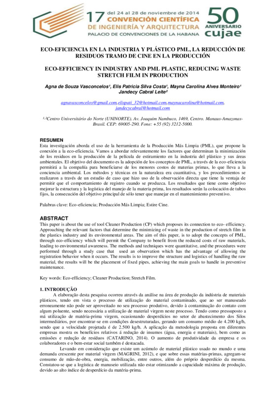 Esta investigación aborda el uso de la herramienta de la Producción Más Limpia (PML), que propone la conexión a la eco-eficiencia. Vamos a abordar relevantemente los factores que determinan la minimización de los residuos en la producción de la película de estiramiento en la industria del plástico y sus áreas ambientales. El objetivo del documento es la adopción de los conceptos de PML, a través de la eco-eficiencia permitirá a la compañía para beneficiarse de los menores costos de materias primas, lo que lleva a la conciencia ambiental. Los métodos y técnicas en la naturaleza era cuantitativa, y los procedimientos se realizaron a través de un estudio de caso que hizo uso de la observación directa que tiene la ventaja de permitir que el comportamiento de registro cuando se produzca. Los resultados que tiene como objetivo mejorar la estructura y la logística del manejo de la materia prima, los resultados serán la colocación de tubos fijos, la consecución del objetivo principal de sólo tener que manejar en el mantenimiento prevent ivo.