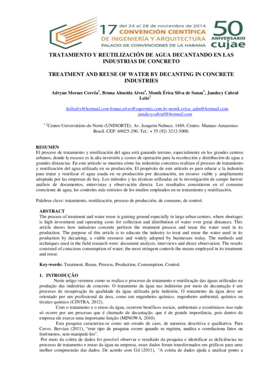 El proceso de tratamiento y reutilización del agua está ganando terreno, especialmente en los grandes centros urbanos, donde la escasez es la alta inversión y costos de operación para la recolección y distribución de agua a grandes distancias. En este artículo se muestra cómo las industrias concretas realizan el proceso de tratamiento y reutilización del agua utilizada en su producción. El propósito de este artículo es para educar a la industria para tratar y reutilizar el agua usada en su producción por decantación, un recurso viable y ampliamente adoptada por las empresas de hoy. Los métodos y las técnicas utilizadas en la investigación de campo fueron: análisis de documentos, entrevistas y observación directa. Los resultados consistieron en el consumo consciente de agua, los controles más estrictos de los medios empleados en su tratamiento y reutilización.