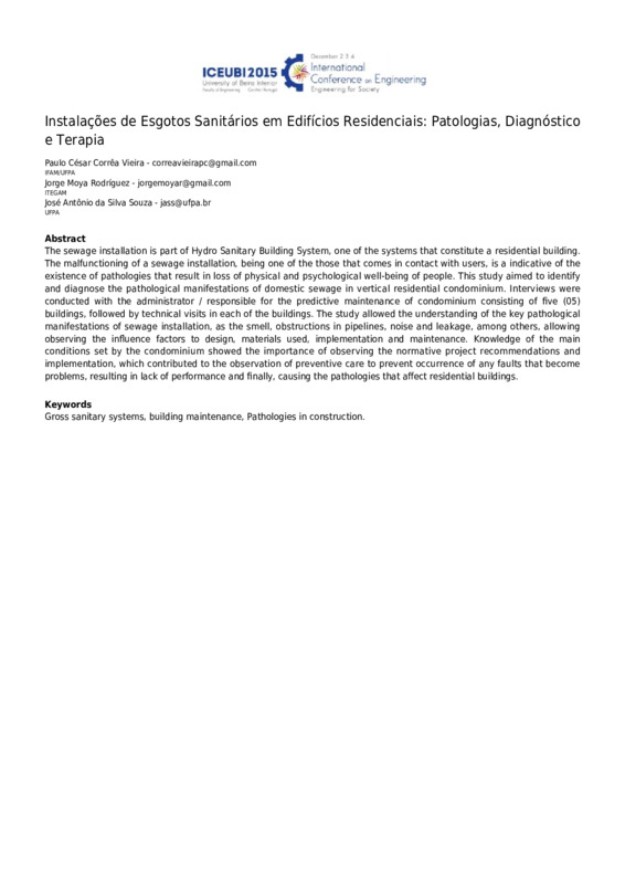 The sewage installation is part of Hydro Sanitary Building System, one of the systems that constitute a residential building. The malfunctioning of a sewage installation, being one of the those that comes in contact with users, is a indicative of the existence of pathologies that result in loss of physical and psychological well-being of people. This study aimed to identify and diagnose the pathological manifestations of domestic sewage in vertical residential condominium. Interviews were conducted with the administrator / responsible for the predictive maintenance of condominium consisting of five (05) buildings, followed by technical visits in each of the buildings. The study allowed the understanding of the key pathological manifestations of sewage installation, as the smell, obstructions in pipelines, noise and leakage, among others, allowing observing the influence factors to design, materials used, implementation and maintenance. Knowledge of the main conditions set by the condominium showed the importance of observing the normative project recommendations and implementation, which contributed to the observation of preventive care to prevent occurrence of any faults that become problems, resulting in lack of performance and finally, causing the pathologies that affect residential buildings.