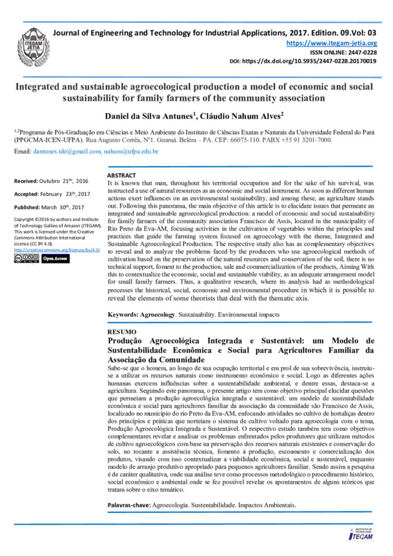 Sabe-se que o homem, ao longo de sua ocupac?a?o territorial e em prol de sua sobrevive?ncia, instruiu- se a utilizar os recursos naturais como instrumento econo?mico e social. Logo as diferentes ac?o?es humanas exercem influe?ncias sobre a sustentabilidade ambiental, e dentre essas, destaca-se a agricultura. Seguindo este panorama, o presente artigo tem como objetivo principal elucidar questo?es que permeiam a produc?a?o agroecolo?gica integrada e sustenta?vel: um modelo de sustentabilidade econo?mica e social para agricultores familiar da associac?a?o da comunidade sa?o Francisco de Assis, localizado no munici?pio do rio Preto da Eva-AM, enfocando atividades no cultivo de hortalic?as dentro dos princi?pios e pra?ticas que norteiam o sistema de cultivo voltado para agroecologia com o tema, Produc?a?o Agroecolo?gica Integrada e Sustenta?vel. O respectivo estudo tambe?m tem como objetivos complementares revelar e analisar os problemas enfrentados pelos produtores que utilizam me?todos de cultivo agroecolo?gicos com base na preservac?a?o dos recursos naturais existentes e conservac?a?o do solo, no tocante a assiste?ncia te?cnica, fomento a? produc?a?o, escoamento e comercializac?a?o dos produtos, visando com isso contextualizar a viabilidade econo?mica, social e sustenta?vel, enquanto modelo de arranjo produtivo apropriado para pequenos agricultores familiar. Sendo assim a pesquisa e? de cara?ter qualitativa, onde sua ana?lise teve como processos metodolo?gico o procedimento histo?rico, social econo?mico e ambiental onde se fez possi?vel revelar os apontamentos de alguns teo?ricos que tratam sobre o eixo tema?tico.