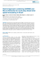 Hybrid Approach combining SARIMA and Neural Networks for multi-step ahead wind speed forecasting in Brazil ABSTRACT This paper proposes a hybrid approach based on SARIMA and Neural Networks for multi-step ahead wind speed forecasting using explanatory variables. In the proposed model, explanatory variables are first predicted, and wind speed forecasting is performed taking into account these forecasted values and wind speed historical series. The multi-step ahead forecasting is achieved recursively, by using the first forecasted value as input to obtain the next forecasting value. The proposed approach is tested using historical records of meteorological data collected from two real-world locations in Brazil. In order to demonstrate accuracy and effectiveness of the proposed approach, the results are compared with other techniques such as Neural Networks, SARIMA and SARIMA+wavelet. Simulation results reveal that the proposed hybrid forecasting method outperforms these popular algorithms for different forecasting horizons with higher accuracy. INDEX TERMS SARIMA model, explanatory variable selection, multi-step ahead, neural networks, wind speed forecasting -